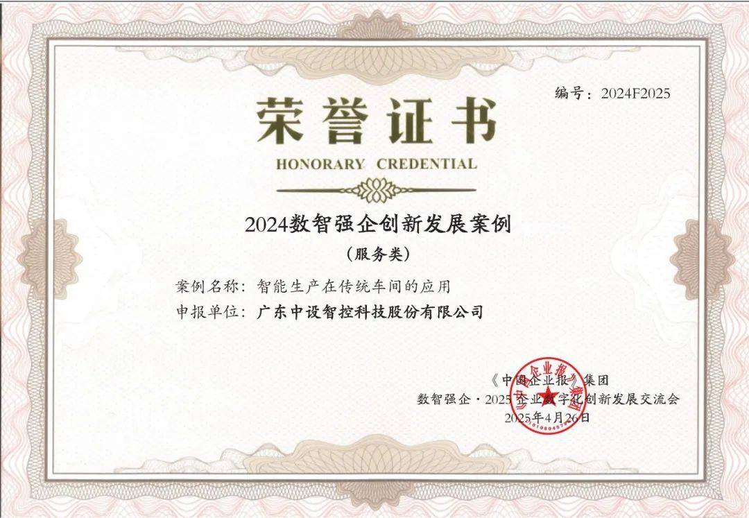 近日,由《中国企业报》集团主办的 “数智强企・2025 企业数字化创新发展交流会” 在北京隆重举行。广东中设智控科技股份有限公司(以下简称“中设智控”)凭借“智能生产在传统车间的应用”项目,入选 “2024数智强企创新发展案例”。