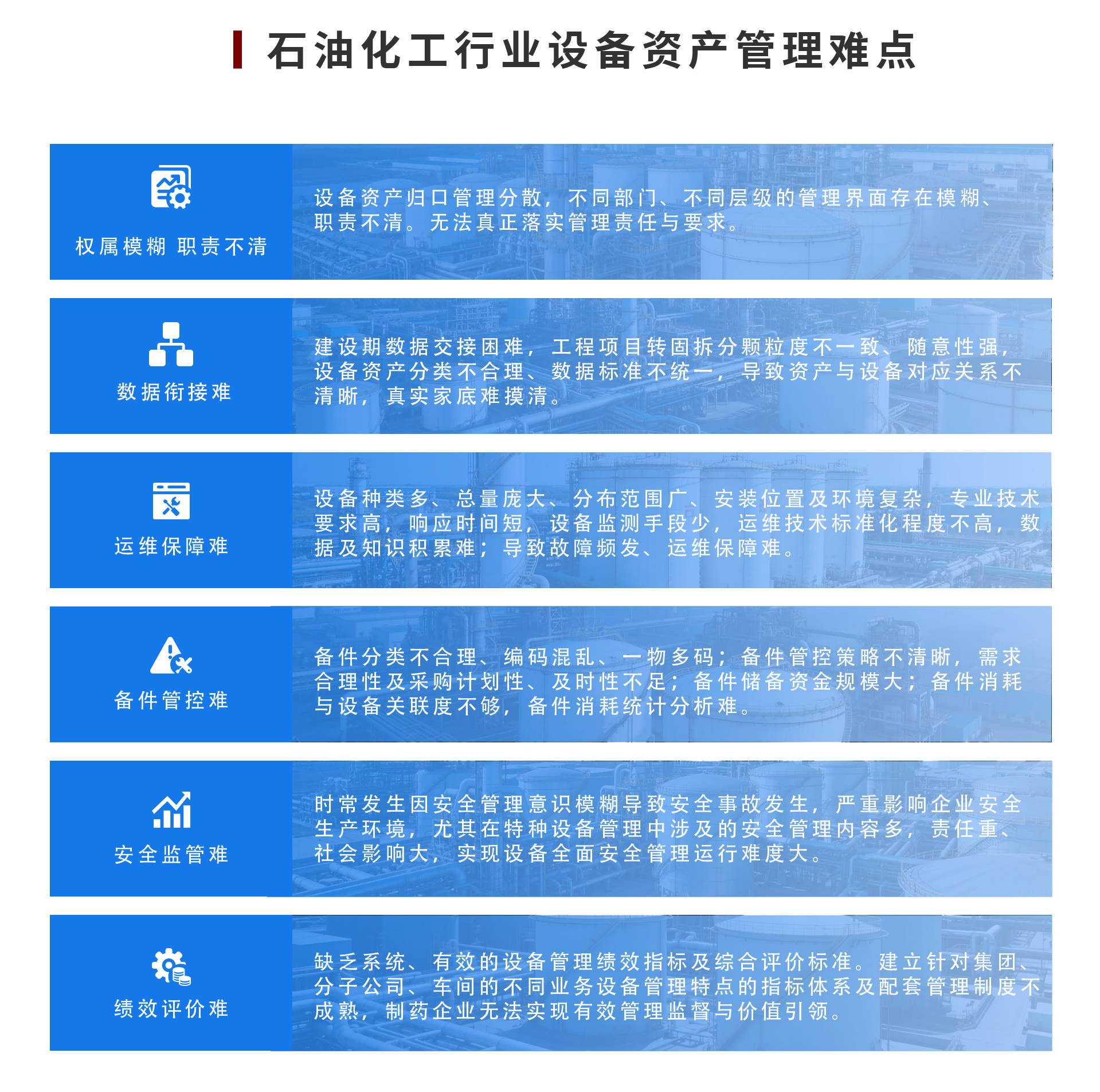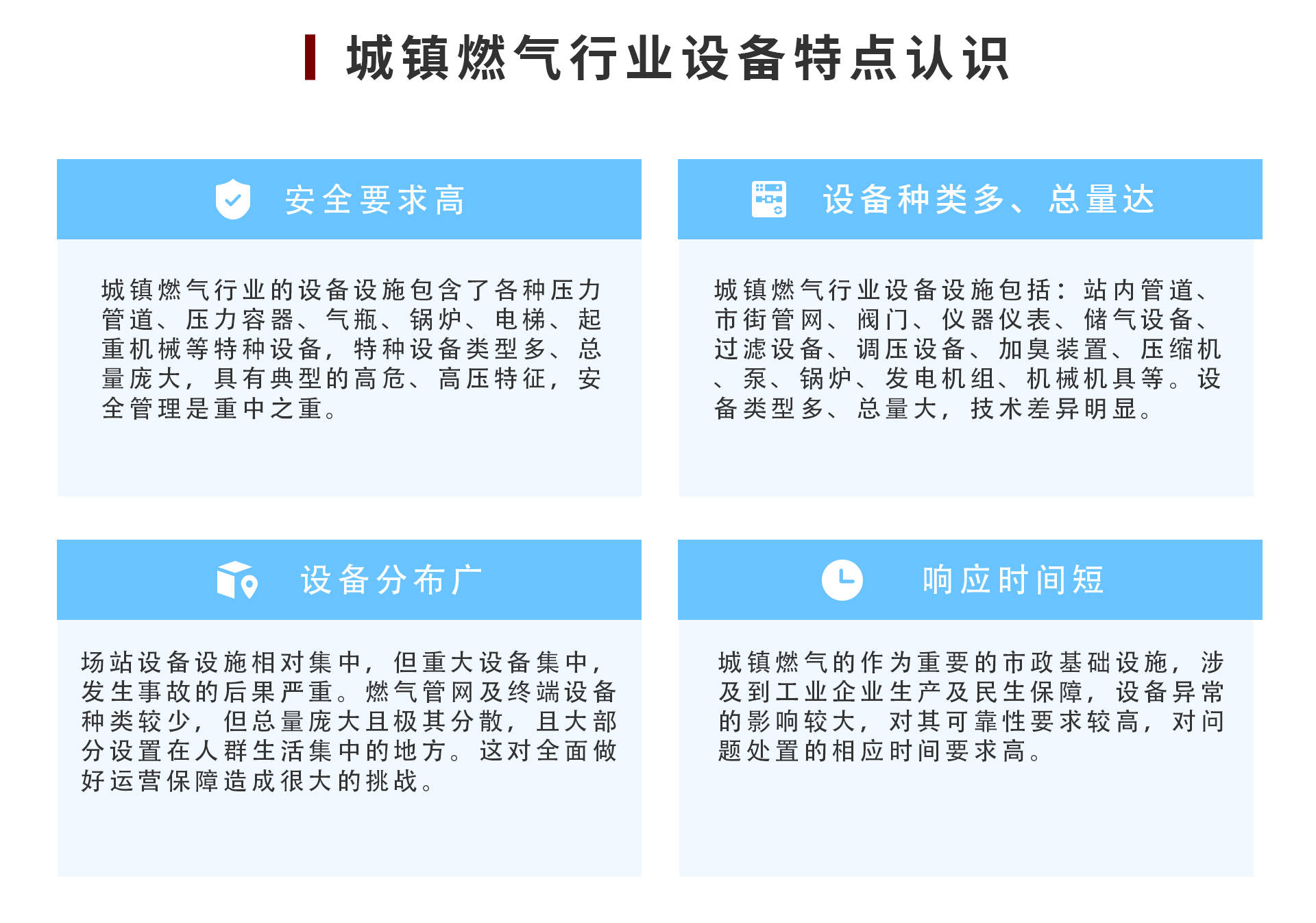 【概要描述】城市燃气行业设备管理因安全要求高、设备种类多且分布广、响应时间短,存在权属模糊、运维保障难、备件管控复杂等痛点,安全监管与绩效评价也面临挑战
