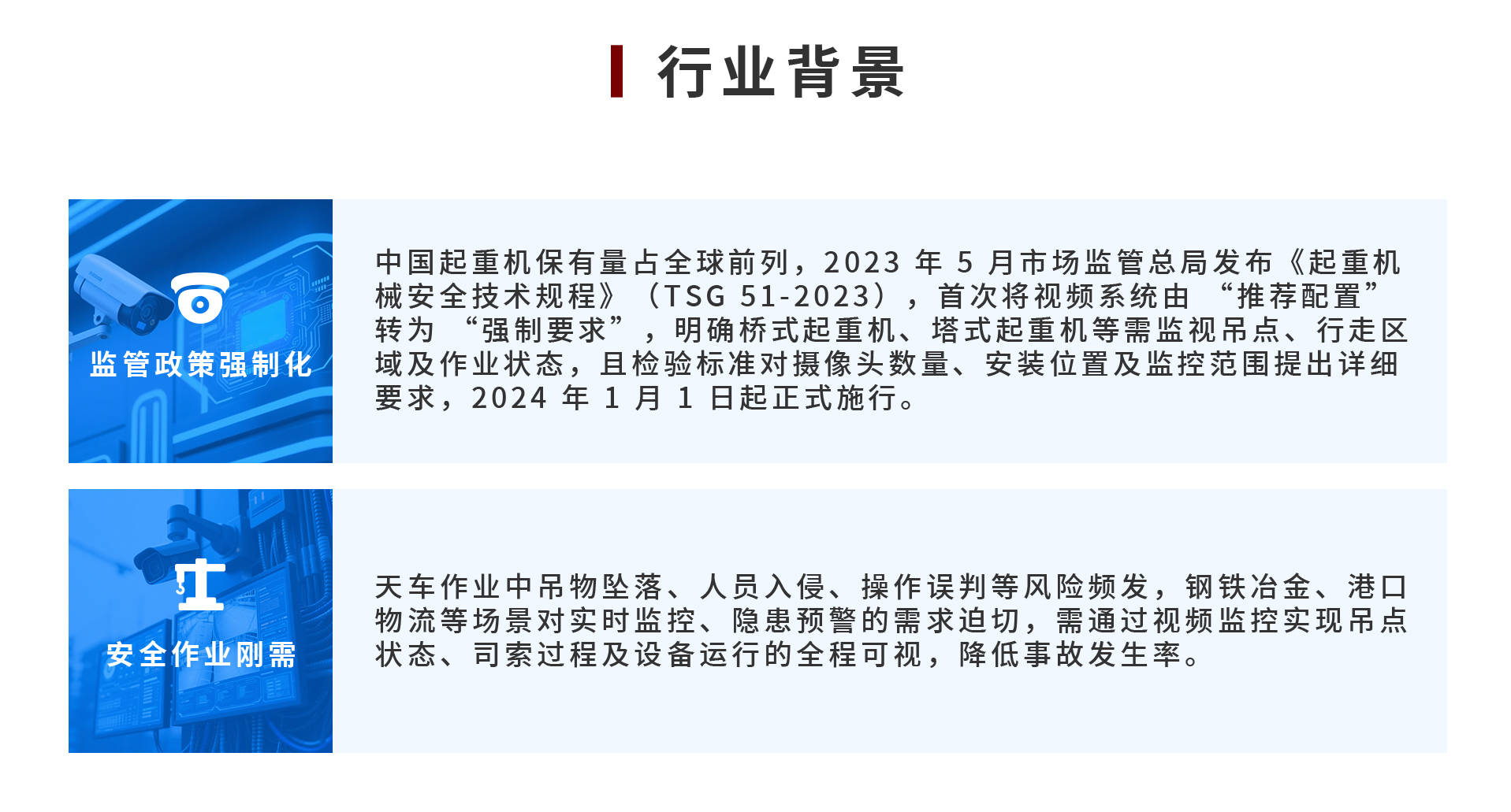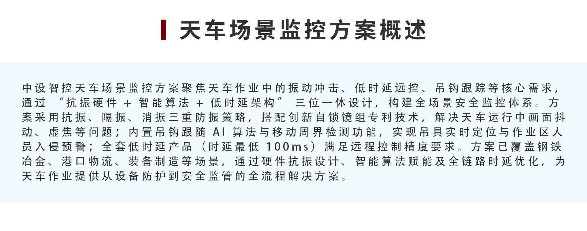 【概要描述】中设智控天车(吊机/起重机/龙门吊)场景监控方案聚焦天车作业中的振动冲击、低时延远控、吊钩跟踪等核心需求,通过“抗振硬件 + 智能算法 + 低时延架构”三位一体设计,构建全场景安全监控体系。方案采用抗振、隔振、消振三重防振策略,搭配创新自锁镜组专利技术,解决天车运行中画面抖动、虚焦等问题;内置吊钩跟随 AI 算法与移动周界检测功能,实现吊具实时定位与作业区人员入侵预警;全套低时延产品(时延最低 100ms)满足远程控制精度要求。方案已覆盖钢铁冶金、港口物流、装备制造等场景,通过硬件抗振设计、智能算法赋能及全链路时延优化,为天车作业提供从设备防护到安全监管的全流程解决方案。