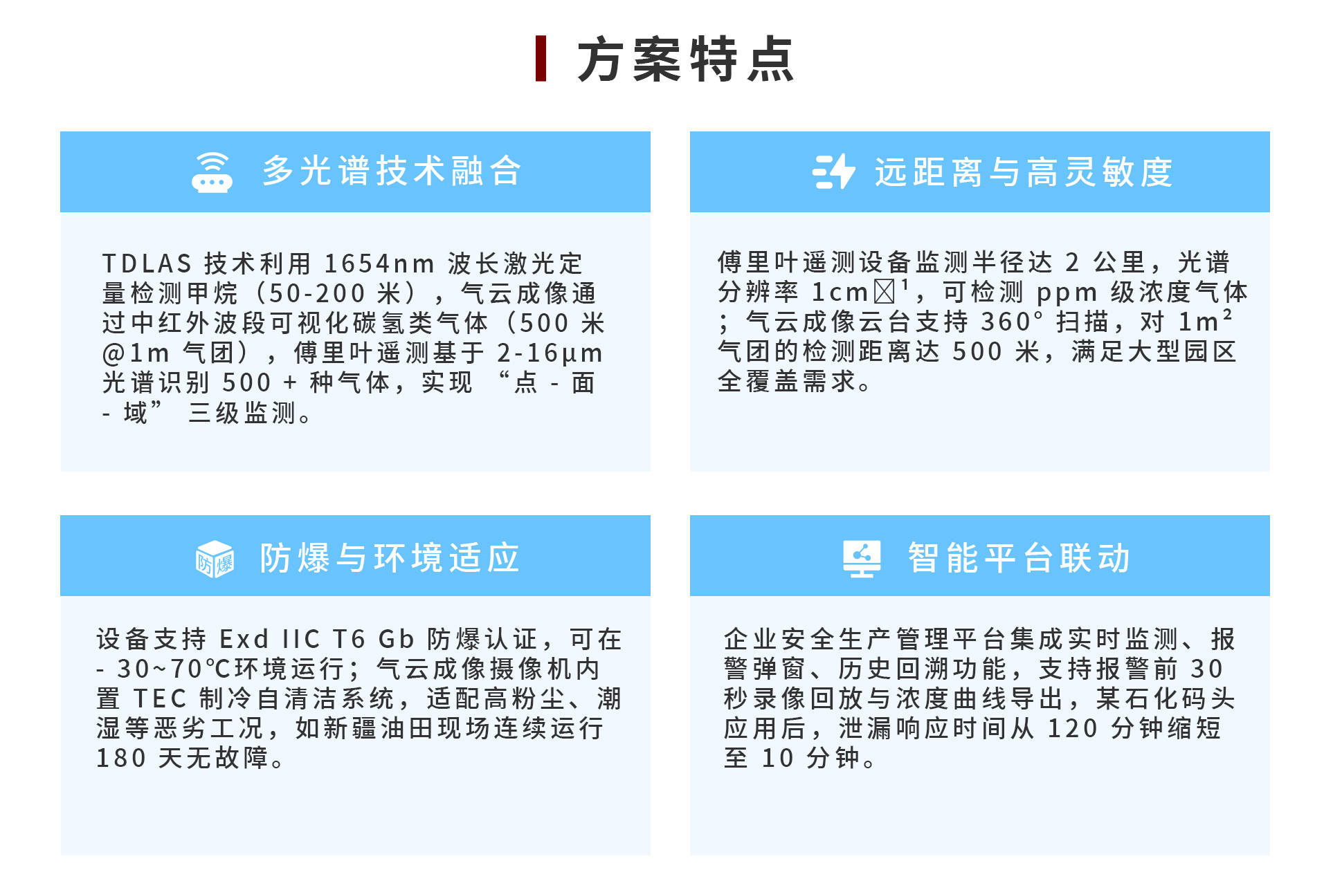 【概要描述】中设智控气体泄漏检测解决方案采用 “光谱技术 + 智能平台” 架构,融合 TDLAS(可调谐半导体激光吸收光谱)、气云成像及高光谱傅里叶遥测技术,实现气体泄漏的大范围精准监测。TDLAS 技术可对甲烷、一氧化碳等单一气体进行 50-200 米距离的定量检测;气云成像技术支持 500 米内碳氢类化合物的可视化监测;傅里叶遥测设备可在 2 公里范围内识别 500 + 种 VOCs 气体。系统通过企业安全生产管理平台实现数据融合,支持实时报警、泄漏溯源及历史数据回溯,已应用于石化、燃气等行业。